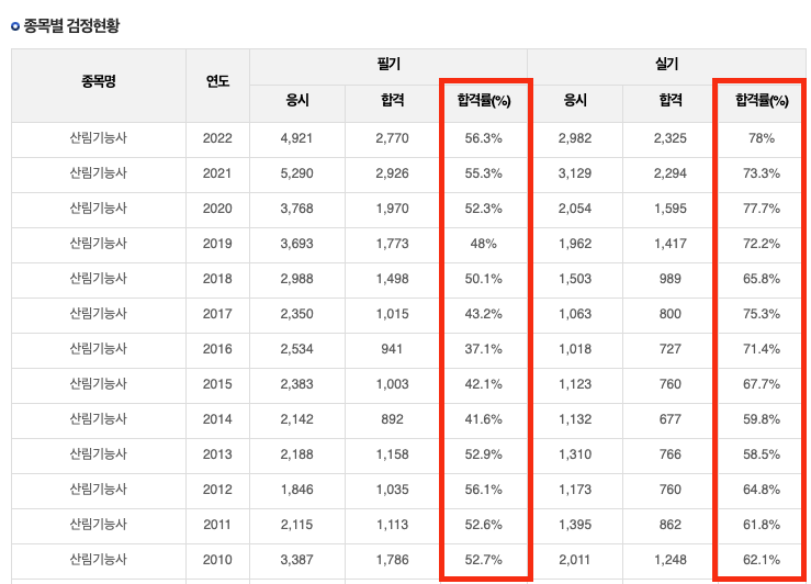 산림기능사 자격증 필기 시험, 실기 시험의 합격률은 아래와 같습니다. 최근 5년 평균 필기 시험은 53%, 실기 시험은 76% 정도의 합격률을 가지고 있습니다. 점점 더 산림기능사 시험의 합격률이 올라가는 것으로 보아, 옛날보다는 좀더 쉬워졌다고 볼 수 있습니다.
